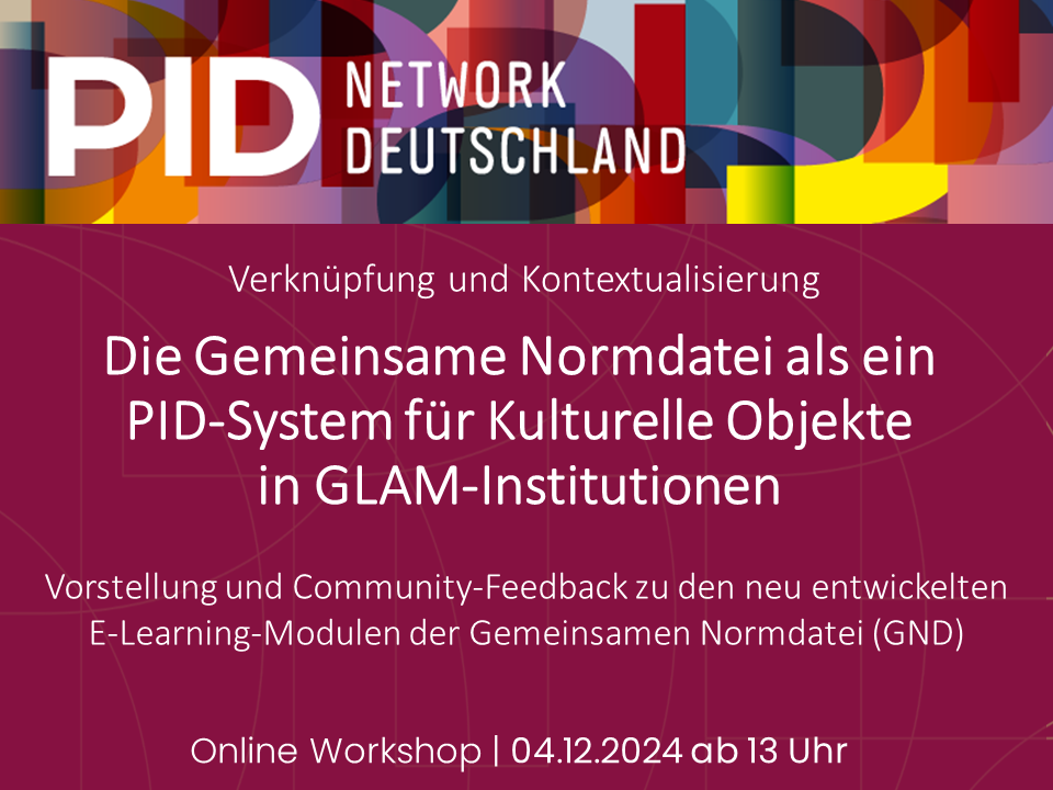 Das Projekt "PID Network Deutschland" organisierte am 04. Dezember 2024 ein Seminar zum Thema „PIDs für kulturelle Objekte und ihre Kontexte“. In dieser Veranstaltung spielte die Bedeutung der GND ("Gemeinsame Normdatei") für die Verbesserung der (Meta)Datenqualität eine zentrale Rolle. PID Systeme wie die GND-ID erlauben nur in Ausnahmefall die Auszeichnungen von Kulturobjekten als Normdatensatz. Nämlich dann, wenn ein entsprechender übergeordneter Referenzierungbedarf besteht. Besonders relevant sind hierbei die GLAM (Galleries, Libraries, Archives, Museums) Institutionen, die durch die Nutzung von GND-Datensätzen das Kontextualisierungspotenzial ihrer Sammlungen erheblich steigern können.